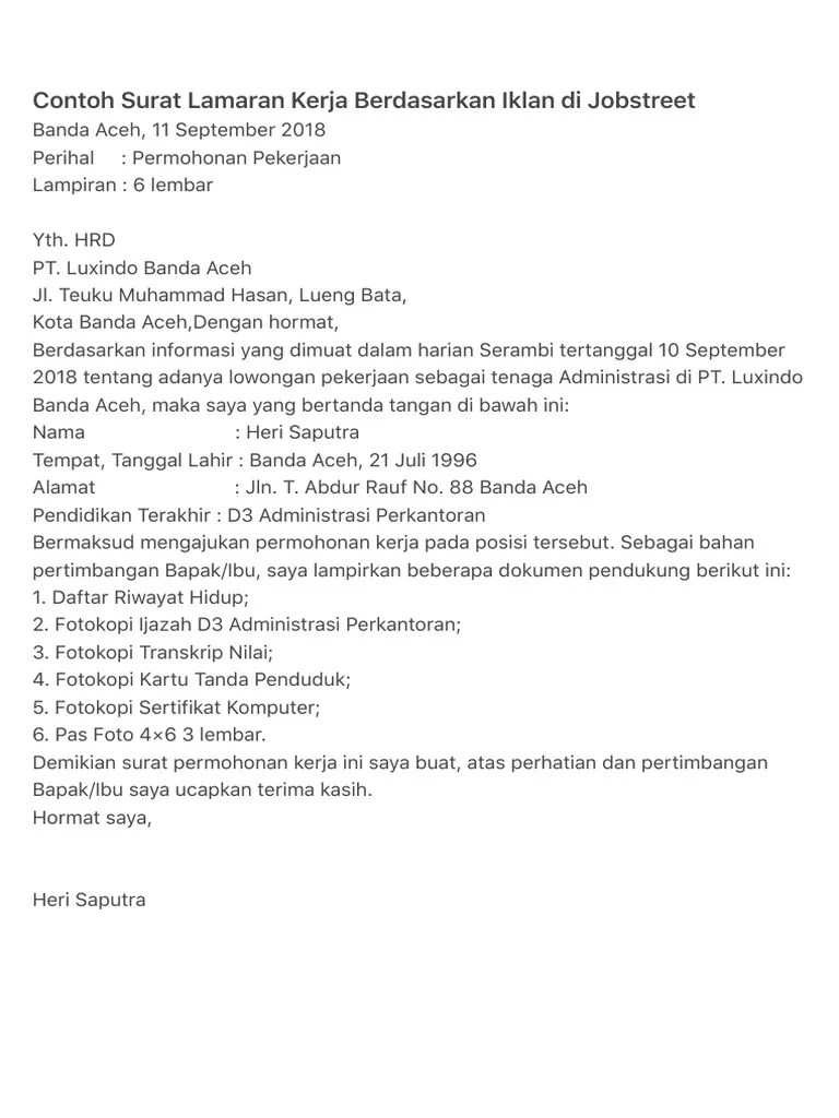 Bagi kamu yang masih bingung, begini contoh surat lamaran pekerjaan . Kumpulan gambar tentang contoh surat lamaran pekerjaan berdasarkan iklan lowongan pekerjaan, klik untuk melihat koleksi gambar lain di kibrispdr.org. Pemasang iklan di harian suara merdeka d.a. . Jika anda tertarik untuk melamar kerja berdasarkan iklan lowongan kerja, . Contoh surat lamaran kerja berdasarkan iklan gresik 18 november 2016 hal : Baik dari surat kabar hingga berbagai platform digital, anda pasti pernah melihatnya. Mayoritas masyarakat mengetahui lamaran pekerjaan melalui iklan baik itu yang ditayangkan oleh media televisi, iklan di surat kabar, maupun iklan lowongan . Surat lamaran kerja berdasarkan iklan hal : Membuat surat lamaran kerja yang baik dan benar tidaklah sulit. Contoh surat lamaran kerja berdasarkan iklan di koran tentunya akan dibutuhkan bagi mereka yang ingin melamar lwoongan pekerjaan yang dimuat di . Lamaran kerja semarang, 12 november 2008 lampiran :